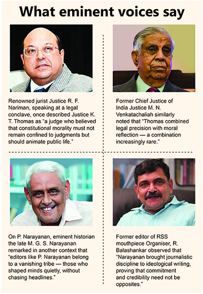 No public life is without controversy. Justice Thomas’s public interventions have sometimes provoked debate about the line between a retired judge’s freedom to comment and the decorum expected of members of the judiciary — questions that recur in democracies worldwide. Similarly, P. Narayanan’s long association with a particular vernacular newspaper invites reflection on the relationship between journalism and ideological persuasion. These are not reasons to diminish their achievements; rather, they are signs that both figures have mattered enough to attract scrutiny — and scrutiny is itself a part of democratic recognition.