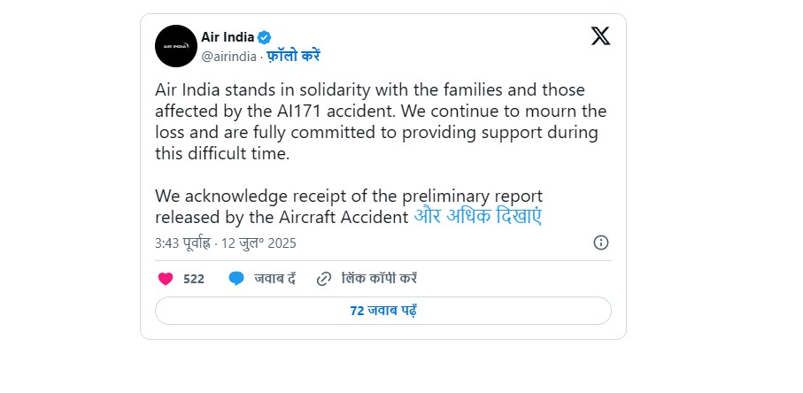 वहीं अहमदाबाद विमान हादसे पर AAIB की प्रारंभिक रिपोर्ट जारी होने के बाद, एयरलाइन ने औपचारिक रूप से दस्तावेज की प्राप्ति की पुष्टि की है। X पर जारी एक सार्वजनिक बयान में, एयर इंडिया ने AAIB और अन्य अधिकारियों के साथ पूर्ण सहयोग करने की अपनी प्रतिबद्धता दोहराई। एयरलाइन ने कहा, "हम इस क्षति पर शोक व्यक्त करते हैं और इस कठिन समय में सहायता प्रदान करने के लिए पूरी तरह प्रतिबद्ध हैं। एयर इंडिया नियामकों सहित सभी हितधारकों के साथ मिलकर काम कर रही है।" हालांकि, जांच की वर्तमान स्थिति के कारण विशिष्ट निष्कर्षों पर टिप्पणी करने से इनकार कर दिया।