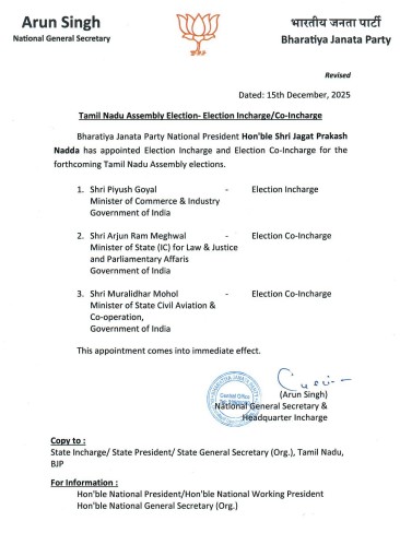 पार्टी के राष्ट्रीय महासचिव अरुण सिंह की ओर से जारी चिट्ठी के मुताबिक राष्ट्रीय अध्यक्ष जेपी नड्डा ने तमिलनाडु विधानसभा के लिए चुनाव प्रभारी और सह प्रभारी की नियुक्ति कर दी है। केंद्रीय मंत्री पीयूष गोयल को चुनाव प्रभारी नियुक्त किया गया है। केंद्रीय कानून मंत्री अर्जुन राम मेघवाल और सिविल एविएशन के राज्यमंत्री मुरलीधर मोहोल को सह प्रभारी नियुक्त किया है।