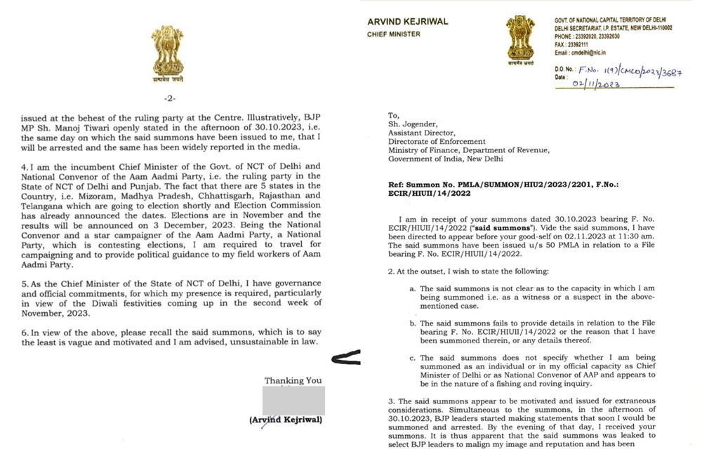 सीएम केजरीवाल ने ईडी को दिए अपने जवाब में कहा है कि यह साफ नहीं है कि आपने मुझे किस नाते समन भेजा है, एक गवाह के तौर पर या फिर संदिग्ध के तौर पर इस समन में किसी तरह की डिटेल भी नहीं दी गई है। यह भी नहीं बताया गया कि मुझे व्यक्तिगत तौर पर बुलाया गया है या फिर मुख्यमंत्री के तौर पर या फिर आम आदमी पार्टी के मुखिया के तौर पर। उन्होंने आगे लिखा है कि जिस दिन ED द्वारा समन जारी किया गया उस दिन भाजपा नेताओं ने बयान देना शुरू किया कि मुझे गिरफ्तार कर लिया जाएगा। सीएम केजरीवाल ने आरोप लगाया कि मेरी छवि को खराब करने के लिए 30 अक्टूबर की शाम को ही भाजपा नेताओं को ED का समन लीक किया गया. 30 अक्टूबर की दोपहर मनोज तिवारी ने बयान दिया था कि मुझे गिरफ्तार कर लिया जाएगा।