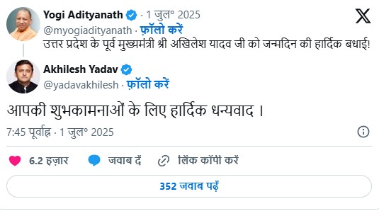 नई दिल्ली: मंगलवार, 1 जुलाई को उत्तर प्रदेश के पूर्व मुख्यमंत्री व समाजवादी पार्टी के सुप्रीमो अखिलेश यादव के जन्मदिन के अवसर पर उत्तर प्रदेश के मुख्यमंत्री योगी आदित्यनाथ ने बधाई दी। अखिलेश यादव के जन्मदिन पर सीएम योगी ने सोशल मीडिया प्लेटफॉर्म 'एक्स' पर उन्हें बधाई दी। योगी ने अपने ट्वीट में लिखा, ‘उत्तर प्रदेश के पूर्व मुख्यमंत्री श्री अखिलेश यादव जी को जन्मदिन की हार्दिक बधाई!’ इस बधाई संदेश का जवाब देते हुए अखिलेश ने भी नरमी भरे अंदाज में लिखा, ‘आपकी शुभकामनाओं के लिए हार्दिक धन्यवाद।’ इस छोटे से संवाद ने एक बार फिर दोनों नेताओं के सियासी रिश्तों को चर्चा का विषय बना दिया।