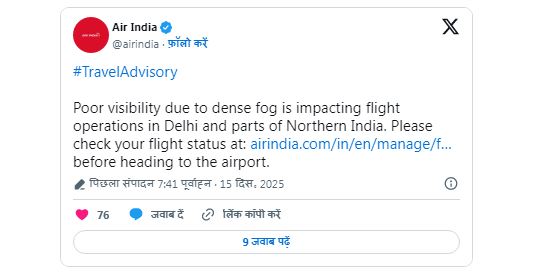 एक्स पर एक पोस्ट के माध्यम से एयर इंडिया ने एडवाइजारी जारी करते हुए लिखा, "यात्रासलाह...घने कोहरे के कारण कम विजिबिलिटी से दिल्ली और उत्तरी भारत के कुछ हिस्सों में फ्लाइट प्रभावित हो रही हैं। हवाई अड्डे जाने से पहले कृपया https://www.airindia.com/in/en/manage/flight-status.html पर अपनी उड़ान की स्थिति की जांच करें।"