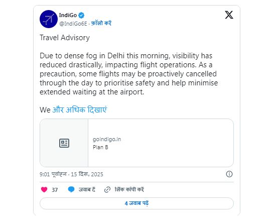 इंडिगो ने अपने पोस्ट में लिखा, "यात्रा सलाह... दिल्ली में कम विजिबिलिटी और कोहरे के कारण फ्लाइट का समय प्रभावित होगा। हम मौसम पर कड़ी नजर रख रहे हैं और आपको सुरक्षित और सुचारू रूप से आपके गंतव्य तक पहुंचाने के लिए हर संभव प्रयास कर रहे हैं। हम आपसे अनुरोध करते हैं कि हमारी वेबसाइट या ऐप के माध्यम से अपनी उड़ान की स्थिति के बारे में अपडेट रहें। निश्चिंत रहें, हमारी टीमें हर कदम पर आपकी सहायता करने और सहयोग सुनिश्चित करने के लिए मौजूद हैं। आशा है कि हवाई यात्रा में सुधार होने से हम जल्द ही आपको बेहतर सेवा प्रदान कर सकेंगे, और इस चुनौतीपूर्ण समय में आपके धैर्य और समझ के लिए धन्यवाद।"