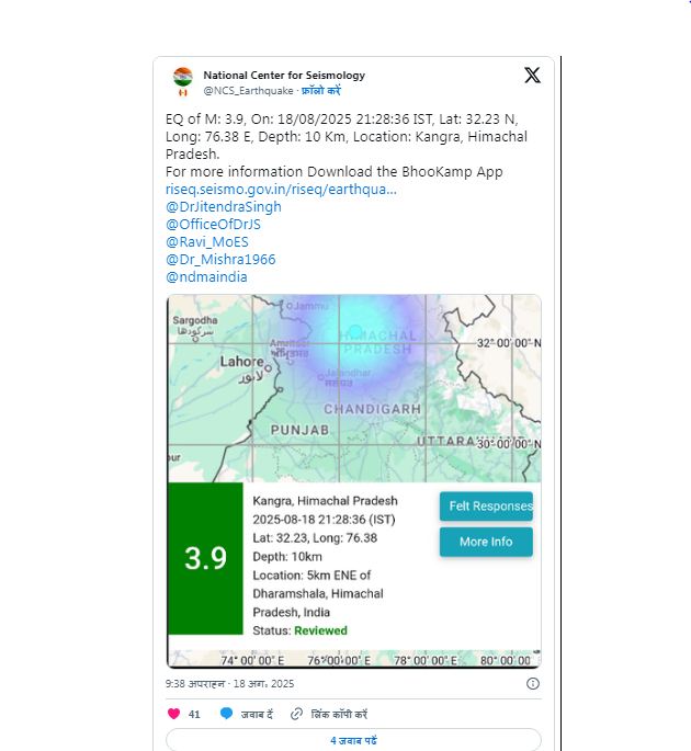 नई दिल्ली: बीते कुछ दिनों से देश के अलग-अलग हिस्सों में भूकंप के झटकों की खबर सामने आई है। ऐसे में हिमाचल प्रदेश के कांगड़ा जिले में सोमवार रात 9:28 बजे भूकंप के झटके महसूस किए गए। राष्ट्रीय भूकंप विज्ञान केंद्र (NCS) के अनुसार, भूकंप की तीव्रता रिक्टर स्केल पर 3.9 मापी गई। इसका केंद्र धर्मशाला से 23 किलोमीटर दूर, 32.23° उत्तर अक्षांश और 76.38° पूर्व देशांतर पर 10 किलोमीटर की गहराई पर था। बता दें कि भूकंप के झटके बैजनाथ, पालमपुर, कांगड़ा, नगरोटा बगवां और धर्मशाला जैसे क्षेत्रों में महसूस किए गए। लोग डर के कारण अपने घरों से बाहर निकल आए। स्थानीय अधिकारियों ने कहा कि इस भूकंप से जान-माल का कोई नुकसान नहीं पहुंचा है।