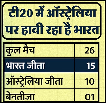 बता दें कि टी 20 में दोनों ही टीमों के बीच कुल 26 मैच खेले गए हैं। जिसमें भारतीय टीम ने कुल 15 मैच में जीत दर्ज की है तो वहीं कंगारु टीम ने 10 मैचों में भारत को हराया है। इस बीच दोनों ही टीमों के बीच 1 मैच का कोई भी नतीजा नहीं आया है।