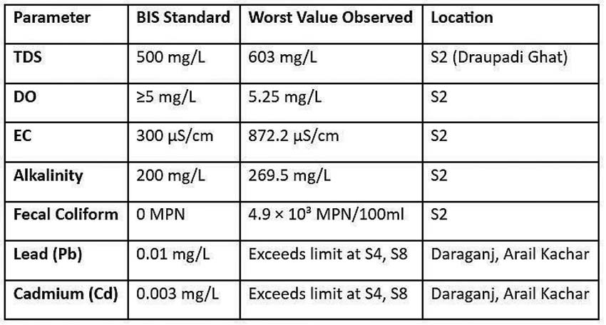 This study results consistently showed that water quality at several sites is far below desirable standards. At Draupadi Ghat (S2) and Arail Kachar (S8), WQI values of 51.97 and 66.98 indicated poor quality. Heavy metal contamination was severe, with HMCI values of 806.01 at Sobatiya Bagh (S1) and 981.33 at Arail Kachar (S8), reflecting high levels of lead (Pb) and cadmium (Cd). The HRI confirmed elevated health risks at these sites.