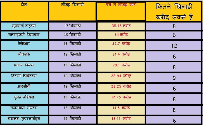 अब ऐसे में इस मिनी ऑक्शन में इन सभी 333 खिलाड़ियों की किस्मत दाव पर होगी। बता दें कि 333 में से 214 भारतीय तो वहीं कुल 119 विदेशी खिलाड़ीयों ने अपनी जगह मिनी आक्शन के लिए पक्की की है। जानकारी के मुताबिक आईपीएल 2024 की सभी टीमें कुल मिलाकर 262.95 करोड़ रुपये के साथ ऑक्शन हॉल में सिरकत करेंगी। बता दें कि इस रकम के साथ सभी फ्रेंचाइजी कुल 77 खिलाड़ियों का ही चयन कर सकती हैं। जिसका प्रमुख कारण केवल 77 स्पॉट्स खाली होना है। इन 77 स्पॉट्स में कुल 30 स्पॉट्स विदेशी खिलाड़ियों के लिए है।