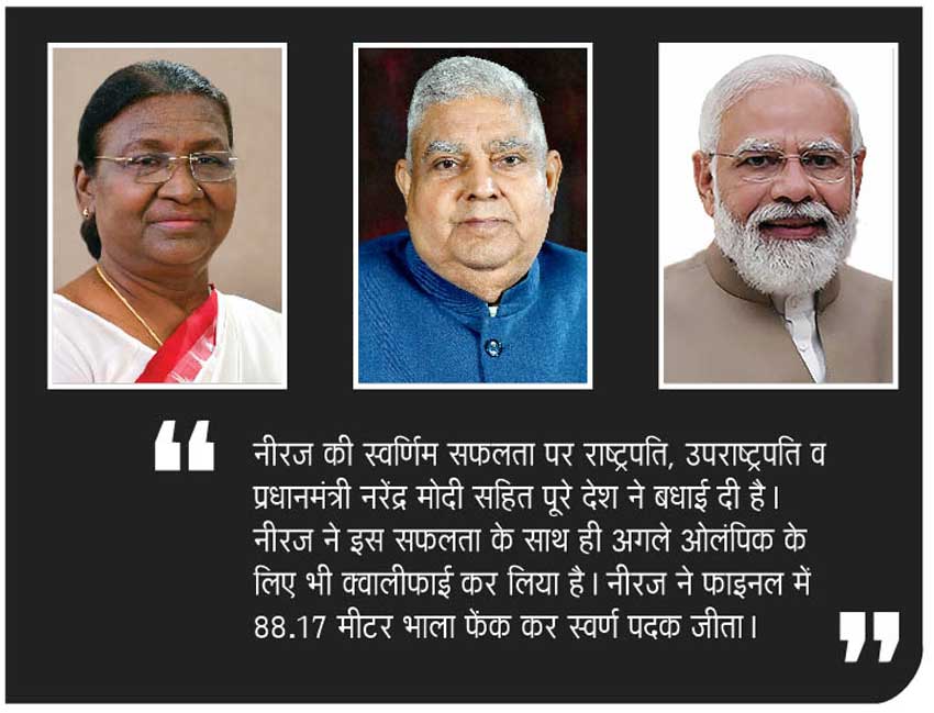 एथलेटिक्स की भालाफेंक प्रतियोगिता में भारत के नीराज चोपड़ा ने हंगरी के बुडापेस्ट में आयोजित विश्व एथलेटिक्स चैपिंयनशिप के फाइनल में पहली बार स्वर्ण पदक जीतकर इतिहास रच दिया है। भालाफेंक में भारत को स्वर्ण दिलाने वाले वह पहले भारतीय एथली टबन गये हैं। नीरज की सफलता से आज संपूर्ण भारत गर्वित व आनंदित है। नीरज की स्वर्णिम सफलता पर राष्ट्रपति, उपराष्ट्रपति व प्रधानमंत्री नरेंद्र मोदी सहित पूरे देश ने बधाई दी है। नीरज ने इस सफलता के साथ ही अगले ओलंपिक के लिए भी क्वालीफाई कर लिया है। नीरज ने फाइनल में 88.17 मीटर भाला फेंक कर स्वर्ण पदक जीता।