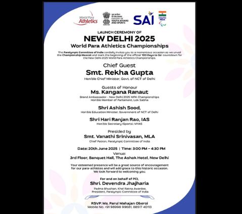 नई दिल्ली: 27 सितंबर से 5 अक्टूबर तक दिल्ली में आयोजित होने वाले विश्व एथलेटिक्स चैंपियनशिप (WPA) के शुभंकर का अनावरण शुक्रवार, 20 जून को दिल्ली की सीएम रेखा गुप्ता के हाथों किया जाएगा। इसके साथ ही चैंपियनसिप के 100 दिनों के COUNTDOWN की भी शुरुआत हो जाएगी। इस बात की जानकारी विश्व पैरा एथलेटिक्स कमिटी की तरफ से दी गई है। बता दें कि इस उद्घाटन समारोह में विश्व पैरा एथलेटिक्स चैंपियनशिप की ब्रांड अंबेसडर लोकसभा सांसद कंगना रनौत, राज्य शिक्षामंत्री आशीष सूद, हरि रंजन राव, वर्ल्ड पैरा चैंपियनशिप की मुख्य पेट्रॉन वानिती श्रीनिवासन समेत कई अन्य पदाधिकारी मौजूद रहेंगे।