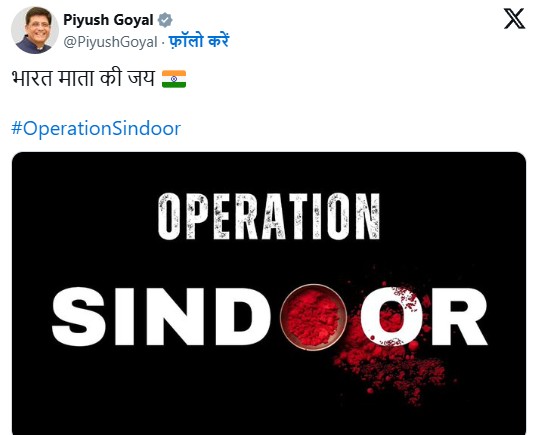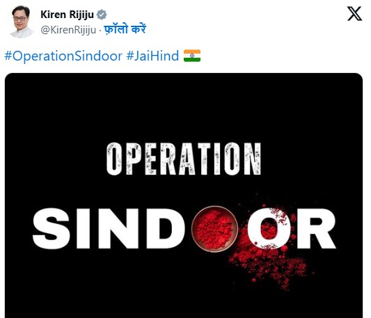 Operation Sindoor: भारत ने पाकिस्तान से पहलगाम आतंकी हमले का बदला ले लिया है। भारतीय सेना ने पाकिस्तान पर हमला कर दिया है। इस बीच केंद्रीय रक्षामंत्री राजनाथ सिंह ने बयान दिया है। उन्होंने सोशल मीडिया साइट एक्स पर लिखा, 'भारत माता की जय।' इसके अलावा उत्तर प्रदेश के मुख्यमंत्री सीएम योगी आदित्यनाथ ने लिखा, जय हिंद, जय हिंद की सेना। ऑपरेशन सिंदूर। वहीं केंद्रीय मंत्री पीयूष गोयल ने एक्स पर लिखा, भारत माता की जय। वहीं केंद्रीय मंत्री किरेन रिजेजू ने एक्स पर लिखा, ऑपरेशन सिंदूर, जय हिंद।