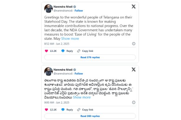 "तेलंगाना राज्य के स्थापना दिवस पर लोगों को बधाई। यह राज्य राष्ट्रीय प्रगति में अनगिनत योगदान देने के लिए जाना जाता है। पिछले दशक में, एनडीए सरकार ने राज्य के लोगों के लिए 'जीवन यापन की सुगमता' को बढ़ावा देने के लिए कई उपाय किए हैं। मैं कामना करता हूं कि राज्य के लोगों को सफलता और समृद्धि मिले।’’
