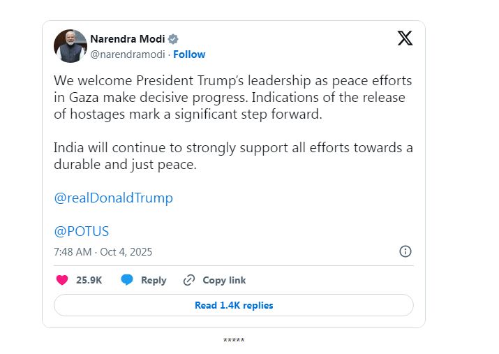 पीएम मोदी ने एक्स पोस्ट करते हुए कहा कि “गाजा में शांति प्रयासों में निर्णायक प्रगति के लिए हम राष्ट्रपति ट्रंप के नेतृत्व का स्वागत करते हैं। बंधकों की रिहाई के संकेत महत्वपूर्ण कदम हैं। भारत स्थायी और न्यायपूर्ण शांति की दिशा में सभी प्रयासों का दृढ़ता से समर्थन करता रहेगा।”