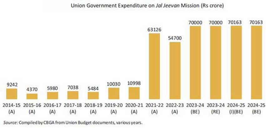 Reflecting its continued priority, the Jal Jeevan Mission has secured a modest increase in allocation within the Union Budget for 2024–25. While the majority of these funds are directed towards constructing the infrastructure necessary for delivering piped water to households, the critical challenge lies in ensuring the sustained availability and safety of this water supply once the infrastructure is in place.