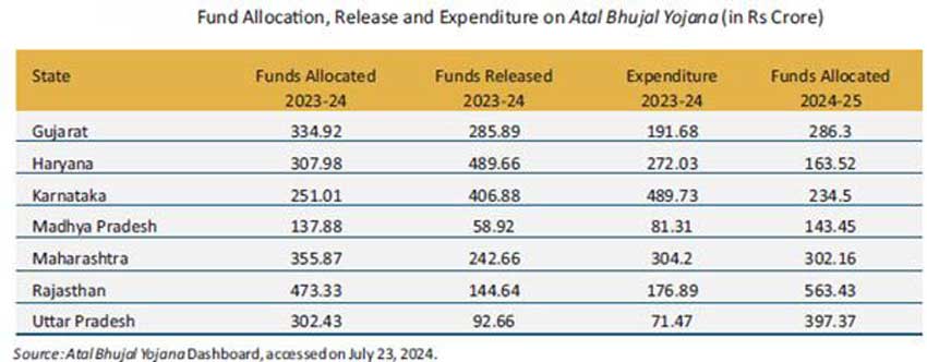 The ABY, launched in 2020 with a Rs 6,000 crore outlay, aims to enhance groundwater management in water-stressed regions. However, budget allocations have decreased, with Rs 1,778 crore allocated for 2024–25, highlighting the need for higher funding and strengthened capacities. Efficient water supply monitoring requires precise data and measurement, but challenges in water availability and quality data persist. The eJalShakti dashboard shows an average water supply of 250 litres per capita per day (LPCD), far exceeding JJM's recommended 55 LPCD, underscoring the need for rigorous data collection and analysis.