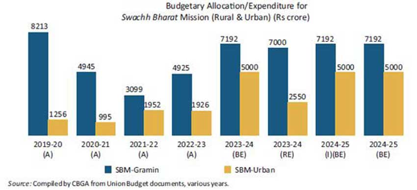 A significant budget is essential for this complex sanitation scenario, aiming to sustain and enhance the ODF status. According to the SBM dashboard, 442,574 villages still need to reach the ODF Plus category, emphasising the need for financial investment not only in infrastructure but also in maintaining community toilets. Despite this, the Union budget for 2024–25 has not increased SBM's funding from the previous year. SBM-Urban saw a 54% increase in 2023–24, but the current year's allocation remains static, even as Phase II strategically focuses on Solid and Liquid Waste Management (SLWM).