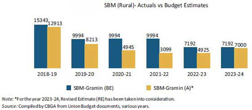 The government plans to promote water supply, sewage treatment, and solid waste management projects in 100 bankable towns, yet this could exclude smaller towns. Funding for SBM-Gramin has been reduced by over 50% from 2016–17 to 2022–23. Actual spending has consistently fallen short of budgeted estimates, highlighting a gap between planned commitments and execution. The static budget allocation could signal a de-prioritization of implementation, which is concerning given SBM II's ambitious goals.