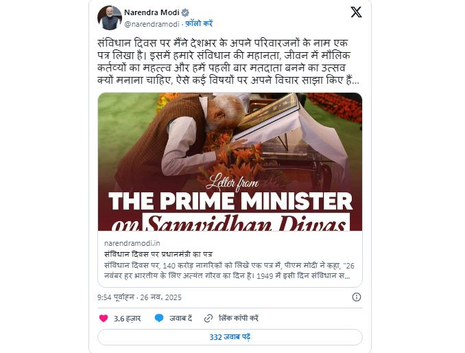 पीएम मोदी ने लिखा, ''संविधान ने हमें मतदान का अधिकार दिया है। एक नागरिक के तौर पर हमारा कर्तव्य है कि मतदान का कोई अवसर छोड़े नहीं। हमें 26 नवंबर को स्कूलों में, कॉलेजों में उन युवाओं के लिए विशेष सम्मान समारोह आयोजित करने चाहिए, जो 18 वर्ष के हो रहे हैं। हमें उन्हें यह महसूस कराना चाहिए कि वे अब केवल छात्र या छात्रा नहीं, बल्कि नीति निर्माण की प्रक्रिया के सक्रिय सहभागी हैं। स्कूलों में हर वर्ष 26 नवंबर को फर्स्ट-टाइम वोटर्स का सम्मान करने की परंपरा विकसित होनी चाहिए। जब हम इस तरह युवाओं में जिम्मेदारी और गर्व का भाव जगाएंगे, तो वे जीवनभर लोकतंत्र के मूल्यों के प्रति समर्पित रहेंगे। यही समर्पण एक सशक्त राष्ट्र की नींव बनता है।''