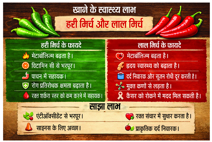 जहां इम्यून सिस्टम को बूस्ट करने के लिए हरी मिर्च का सेवन किया जा सकता है, तो वहीं वजन घटाने के लिए लाल मिर्च का इस्तेमाल किया जा सकता है। गट हेल्थ को सुधारने के लिए हरी मिर्च या फिर लाल मिर्च, दोनों में से किसी का भी सेवन किया जा सकता है। अगर आप खाने को ज्यादा तीखा बनाना चाहते हैं, तो लाल मिर्च यूज करें। अगर आप खाने को कम तीखा बनाना चाहते हैं, तो हरी मिर्च का इस्तेमाल कर सकते हैं। ध्यान रहे कि मिलावट वाली हरी मिर्च या फिर लाल मिर्च न खरीदें वरना आपको सेहत से जुड़ी कई समस्याओं का सामना करना पड़ सकता है।